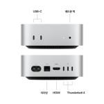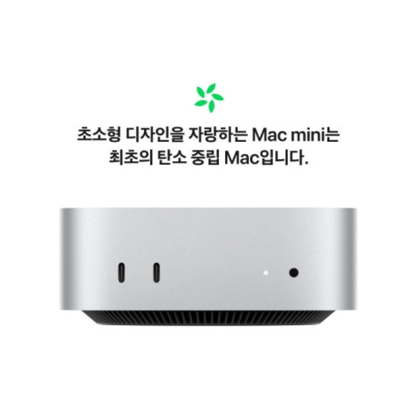 작은 몸, 큰 임팩트—가로세로 12.7cm에 불과한 작은 크기를 자랑하는 Mac mini는 모니터 아래는 물론 장소에 상관없이 어디든 놓고 사용할 수 있습니다. 편리한 연결성—후면의 Thunderbolt, HDMI, 기가비트 이더넷 포트 그리고 전면의 USB-C 포트와 헤드폰 잭이 선사하는 확장된 연결성을 누릴 수 있습니다. 막강한 성능의 M4 칩 탑재—강력한 M4 칩이 선사하는 놀라운 성능 덕분에 모든 것이 매끄럽고 빠릿빠릿하게 돌아갑니다. Apple Intelligence를 위한 탄생—Apple Intelligence는 당신이 글을 쓰고, 개성을 표출하고, 이것저것 척척 처리하는 것을 도와주는 개인용 지능 시스템입니다. 혁신적인 개인정보 보호 기능도 갖추고 있어 Apple은 물론 그 누구도 당신의 개인정보에 접근할 수 없으니 안심하고 쓸 수 있죠.1 앱을 쏜살같이 빠르게 구동하는 Apple Silicon2—Microsoft Excel부터 Adobe Photoshop, Zoom에 이르기까지 당신이 즐겨 쓰는 모든 앱이 macOS에서는 전광석화처럼 빠르게 실행됩니다. iPhone을 사랑한다면 Mac도 사랑하기 마련—Mac을 당신의 다른 Apple 기기와 함께 사용하면 마법 같은 경험을 할 수 있습니다. ‘iPhone 미러링’ 기능으로 Mac에서 iPhone 화면을 확인 및 조작할 수 있습니다.3 iPhone에서 복사한 내용을 Mac에 붙여넣을 수도 있죠. Mac에서 ‘메시지’ 앱으로 문자를 보내고 FaceTime 통화를 걸거나 받을 수도 있답니다.4 개인정보 보호 및 보안 기본 탑재—모든 Mac은 바이러스 및 악성코드를 막아내는 철통같은 보안 시스템을 갖추고 있습니다. Mac을 분실하거나 도난당한 경우 ‘나의 찾기’ 앱의 도움을 받아 기기를 찾을 수 있고, FileVault는 파일을 암호화해 다른 사람이 접근할 수 없도록 지켜줍니다. 게다가 Mac을 안전하게 보호해주는 무료 보안 업데이트도 제공되죠. 탄소 중립—Mac mini는 탄소 중립 제품입니다. 환경을 위한 Apple의 노력에 대해서는 apple.com/kr/2030에서 더 자세히 알아볼 수 있습니다.