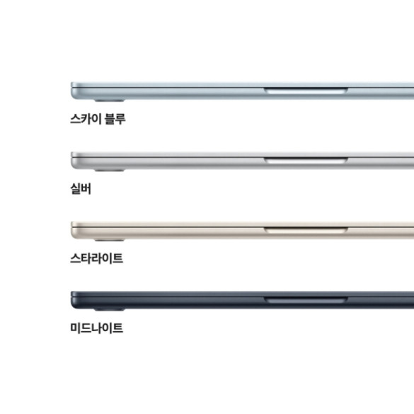 막강한 성능의 M4 칩 탑재—여러 앱을 넘나들며 작업할 때도, 동영상을 편집할 때도, 고사양 그래픽 게임을 플레이할 때도, Apple M4 칩이 무슨 일이든 더 빠르게, 더 매끄럽게 처리해 냅니다. Apple Intelligence를 위한 탄생—Apple Intelligence는 당신이 글을 쓰고, 개성을 표출하고, 이것저것 척척 처리하는 것을 도와주는 개인용 지능 시스템입니다. 혁신적인 개인정보 보호 기능도 갖추고 있어 Apple은 물론 그 누구도 당신의 개인정보에 접근할 수 없으니 안심하고 쓸 수 있죠.1 최대 18시간의 배터리 사용 시간2—MacBook Air는 배터리만으로 작동 중일 때도, 전원에 연결했을 때도 똑같이 놀라운 성능을 선사합니다. 가뿐한 휴대성—엄청나게 가벼운 무게와 1cm 남짓한 두께로 가방에 쏙 들어가는 MacBook Air는 이동이 잦은 당신의 일상에도 자연스레 스며듭니다. 찬란한 디스플레이—34.5cm Liquid Retina 디스플레이가 10억 개의 색상을 지원합니다.3 풍부한 대비와 또렷한 디테일로 사진 및 동영상은 더욱 생생하게, 텍스트는 짱짱한 선명함으로 보여주죠. 당신의 모습과 목소리를 최고의 상태로—12MP Center Stage 카메라가 또렷한 화질을 선사하고, 3개의 마이크, 공간 음향을 지원하는 4개의 스피커가 뛰어난 음질을 선사합니다. 뛰어난 연결성—MacBook Air는 Thunderbolt 4 포트 2개, MagSafe 충전 포트, 헤드폰 잭, Wi-Fi 6E, Bluetooth 5.3을 갖추고 있습니다.4 게다가 외장 디스플레이를 최대 2대까지 지원하죠. 앱을 쏜살같이 빠르게 구동하는 macOS5—Microsoft 365, Adobe Creative Cloud, Google Workspace 등 당신이 즐겨 쓰는 모든 앱이 macOS에서는 전광석화처럼 빠르게 실행됩니다. iPhone을 사랑한다면 Mac도 사랑하기 마련—Mac을 당신의 다른 Apple 기기와 함께 사용하면 마법 같은 경험을 할 수 있습니다. ‘iPhone 미러링’ 기능으로 Mac에서 iPhone 화면을 확인 및 조작할 수 있습니다.6 iPhone에서 복사한 내용을 Mac에 붙여넣을 수도 있죠. Mac에서 ‘메시지’ 앱을 사용해 문자를 보내고, FaceTime 통화를 걸거나 받을 수도 있답니다.7